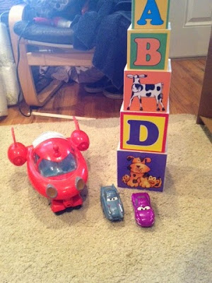 We also scored a few toys, not too many.  PC likes to play with cars, although these aren't the ones I thought they were the ones that rev and then crash into each other, but they do make noise.